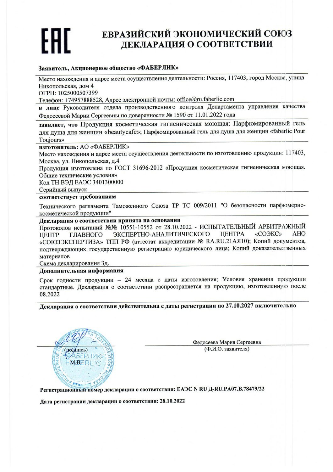 Изготовлено по заказу АО «Фаберлик», Россия, Москва, ул. Никопольская, 4