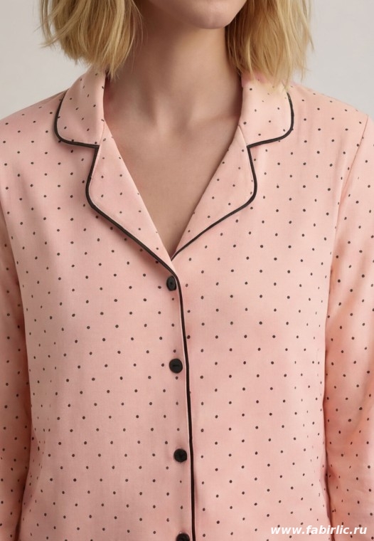 Рубашка-пижама в горошек из мягкого трикотажа: прямой крой, лацканы, тесьма-окантовка и пуговицы — нежный и стильный домашний образ.