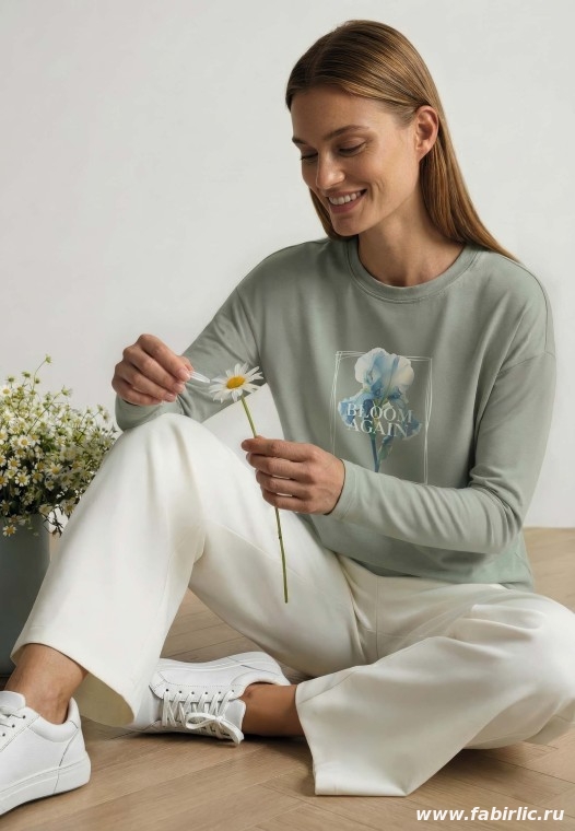 Этот лонгслив сочетает мягкий оттенок серой мяты, деликатный принт и комфортную посадку для повседневных образов весны и лета.